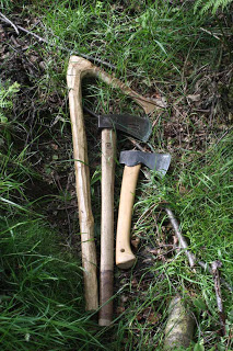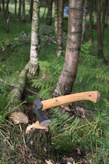 When running courses I also need nice straight grained wood and for this I normally visit a birch woodland which was planted by a friends 20 years ago, he is steadily thinning it and I can use the proceeds for spoons. This time I took the opportunity to experiment felling trees with my bronze axe, a Japanese axe and a little wildlife hatchet. All did the job remarkably well actually.