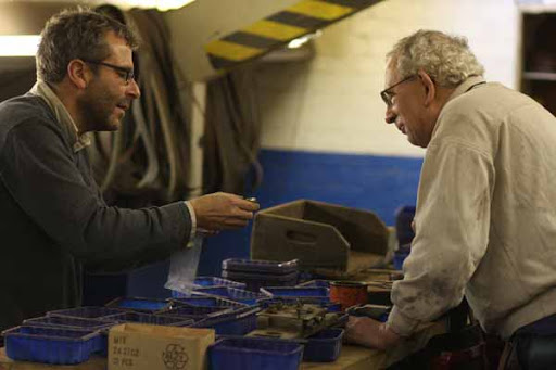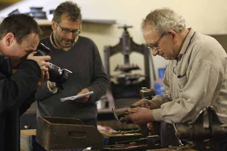 Next it was off to meet Jon Henley of the Guardian. He is  doing a feature on Trevor Ablett pen and pocketknife maker who I have blogged about before. It will be part of his excellent “disappearing acts” series and will be in the Sat 23rd Jan Guardian. But my blog readers get a sneak preview. Jon writing, Chris photographing, Trevor posing.