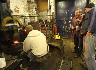 Over a hasty lunch we discussed the work of the HCA, the plight of traditional crafts, the fact that at both national and local level we are not recognised within the arts and culture area (where the inovative has been prioritised over the traditional) nor as heritage whish is restricted to buildings and monuments. Just round the corner at Portland Works we saw an excellent example. Portland is the first place in the world where stainless steel was made into cutlery. I suspect that approaching half the worlds population use stainless cutlery today making it a more widely used cultural export than the English language. We visited the workshop where that first cutlery would have been forged which is still used today for forging tools, the last place in Sheffield forging tools like bolster chisels.