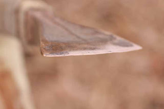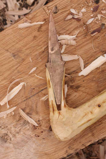This shows how the end of the wood stops short of the cut away in the palstave, if it touches the head seems to bounce loose.