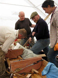 We had to rapidly dispense with the formers, bend freehand and rig extra levers which gripped the plank and put a twist in it to push the base in and top out. It worked but it all took too long so when it had cooled down and we took the clamps off it sprung back too much. This is the same end of the same timber after having been steamed a second time and held in place with the clamps.