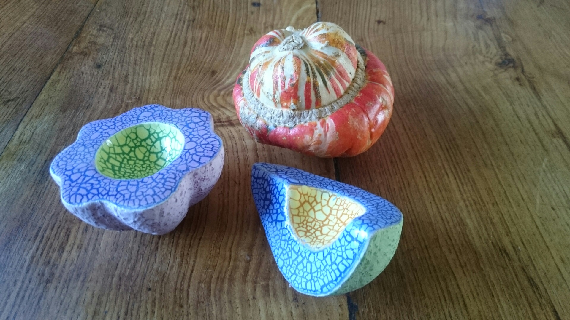 A 7984Two lesser known aspects of Kate’s work are her work bringing ceramics back into architecture with large building frontages and her work on glaze research, she is a superb technician with a deep understanding of her materials. What even fewer folk know about Kate is that she is also a lover of the humble kitchen pot. She told me once that if she could survive doing it in her London home she would be every bit as happy making humble everyday jugs and mugs. A few years ago we traded a porringer and spoon for some of her small sculptural pieces, I love the textures and colours.
